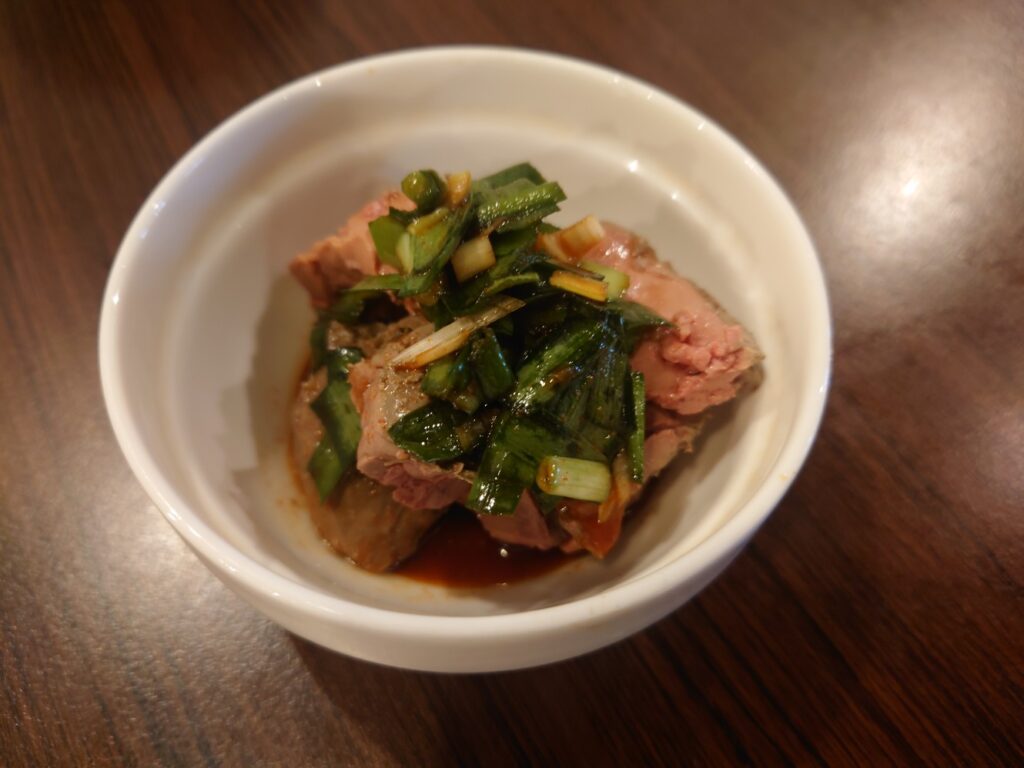 レバニラ醤油は鶏レバを低温調理したものに自家製ニラ醤油をかけた物になります。