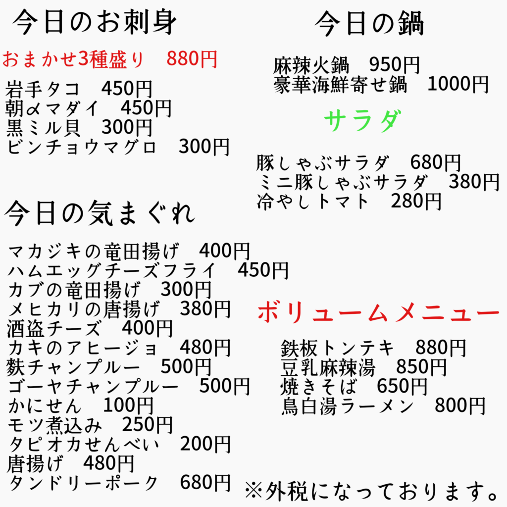 今日の唐揚げはブラックペッパーを聞かせたニンニク醤油味です、市場が休みの為刺身の残りが少なくなってます売り切れの際はご容赦下さい。