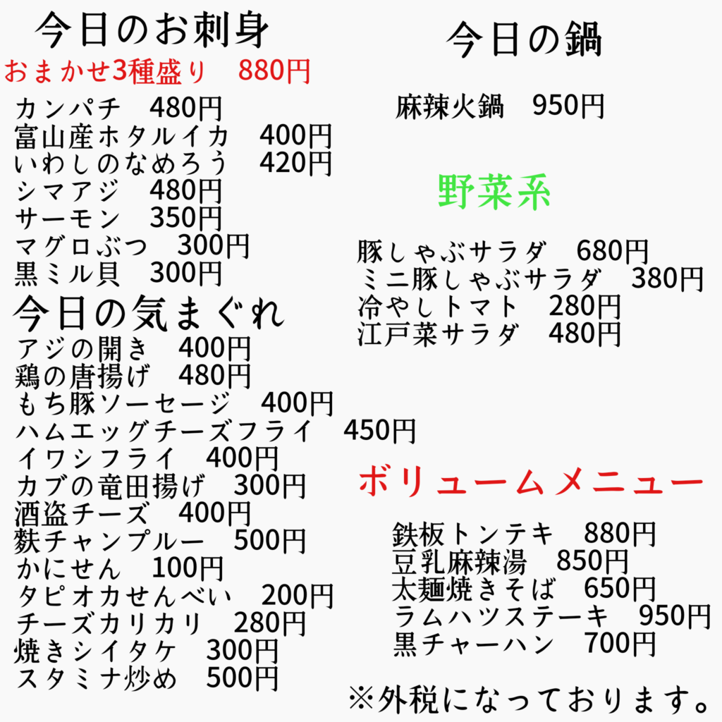 本日のメニュー